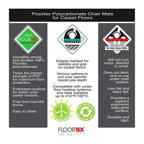 1. CLEARTEX® chair mat is made from original FLOORTEX® polycarbonate, which provides the ultimate in surface protection due to its incredible durability, high clarity and rigidity. Polycarbonate has been formulated to be the perfect compound for use in chair mat manufacturing and is the same material as used in bullet proof glass and aircraft windows! FLOORTEX® only use 100% virgin material for maximum performance! With no cracking, curling, discolouring, cupping or smelling this polycarbonate chair mat delivers an excellent, long-life solution combined with exceptional value.